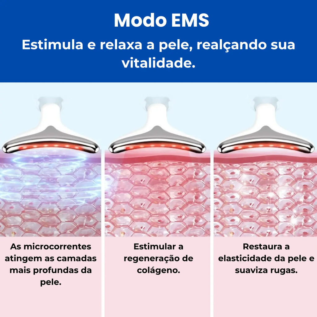 o Modo EMS: Luz Vermelha. Emprega microcorrentes para estimular os músculos faciais, melhorando a firmeza da pele.