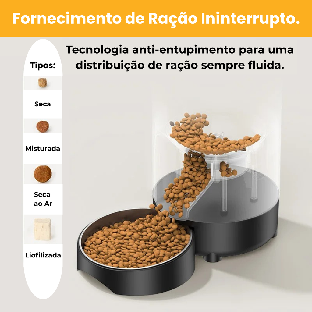 - 🚫 Tecnologia Anti-Bloqueio (Anti-Jamming): Tenha tranquilidade nas viagens e na correria da rotina. O sistema inteligente detecta e reverte rotações para impedir que a ração trave, garantindo que a comida sempre desça suavemente.